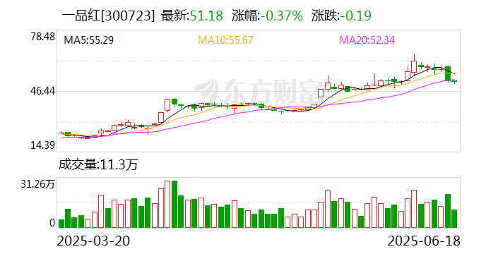 2025年1月至今,一品红(300723)股价一路上涨,从1月底15.01元的攀升至6月10日65.70元的高点,涨幅达到337.7%,期间4月涨势扩大,4月11日和5月20日收获涨停板。